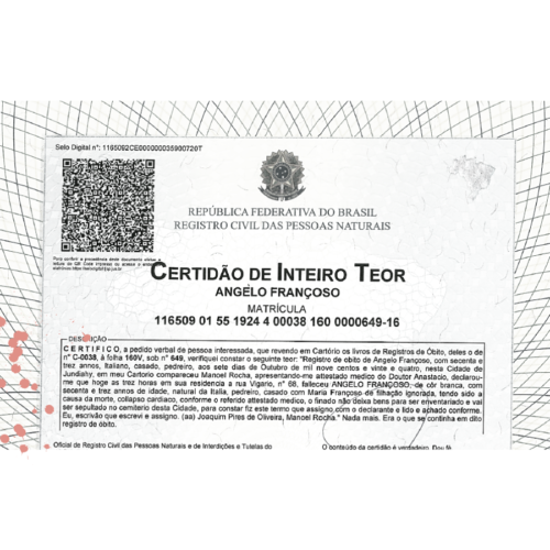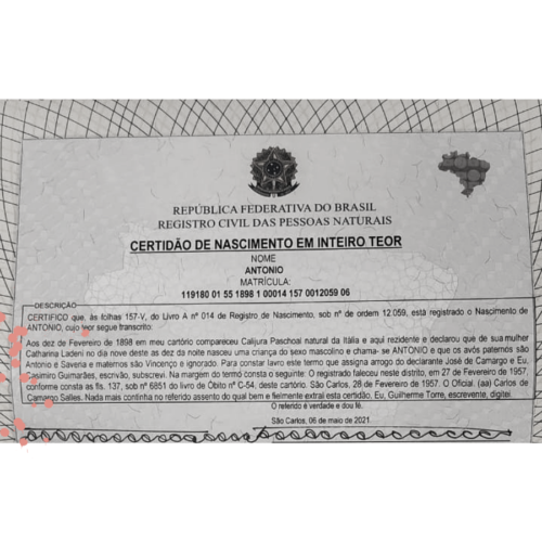 O último registro fundamental brasileiro é o nascimento do filho do italiano no Brasil, ou filhos se você conseguir também de outros irmãos.