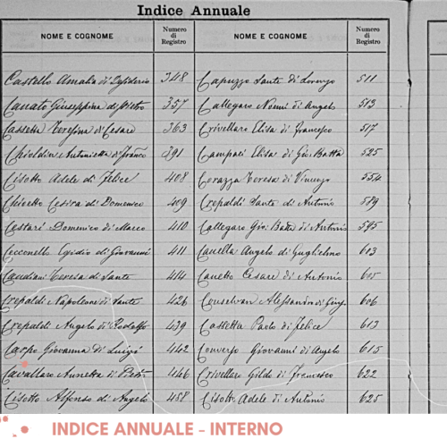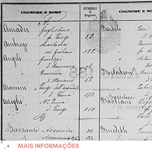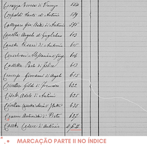 Alguns índices trazem também mais alguma informação como o nome do pai (abaixo fu Luigi e di Domenico) ou mesmo o nome do esposo (nei Guiliani): mais uma forma de confirmar se é aquele registro que você está procurando ainda no índice.